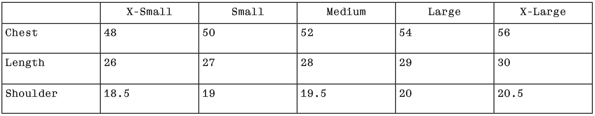 SIZE CHART (IN INCHES)