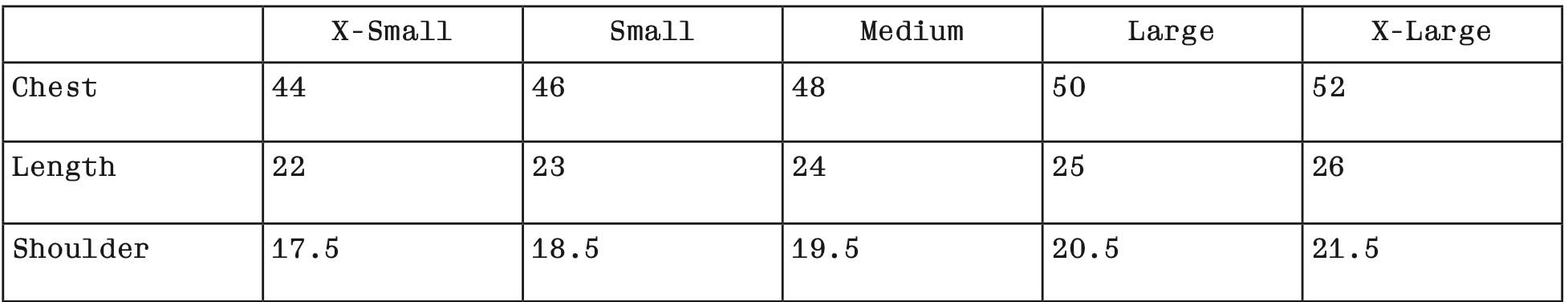 SIZE CHART (IN INCHES)